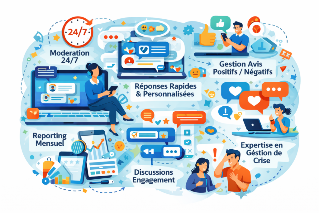 Notre équipe dédiée assure une présence humaine et réactive sur tous vos réseaux sociaux. Nous répondons aux questions, gérons les avis, modérons les discussions et créons des interactions qui renforcent la confiance envers votre marque.