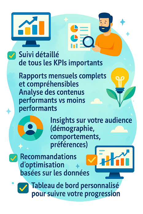 Nos rapports mensuels vous offrent une vue d’ensemble complète : engagement, portée, croissance de communauté, et surtout, l’impact commercial de votre présence sociale. Nous n’analysons pas seulement pour analyser : nous optimisons constamment votre stratégie basée sur les données.