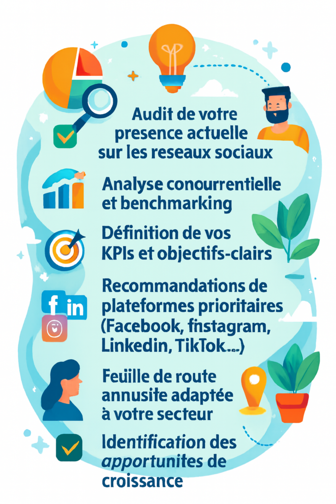 Notre expertise couvre le choix des réseaux sociaux à votre croissance, la définition de votre stratégiet, la fréquence de publication et les types de contenus qui résonnent avec votre public.